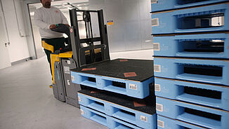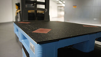 The challenge with this application lies in the capability of this special mat to absorb the high point loads generated by the metal feet on drums. Both automated and manual transport technology requires the precise positioning of the drums. Special inlays on the REGUPOL cargo mat 1000® makes this easier to achieve and make sure the centre of gravity is in the right position when the drums are transported. Thanks to sliding friction coefficients that remain very good even at low temperatures in cold storage, practical tests during automated forklift transport have shown that even emergency braking, among other things, does not cause the drums to slip.
